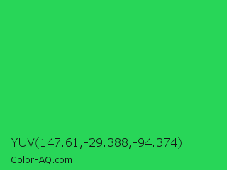 YUV 147.61,-29.388,-94.374 Color is a normal green color and the nearest color is Malachite #0bda51. Hex code #28d658 and RGB value is rgb(40,214,88). In RGB color space, this color is composed of 16% red, 84% green, 35% blue, In CMYK color space, this color is composed of 81% cyan, 0% magenta, 59% yellow , 16% black , In HSL color space, this color has a hue angle of 137° , 69% saturation and 50% lightness.