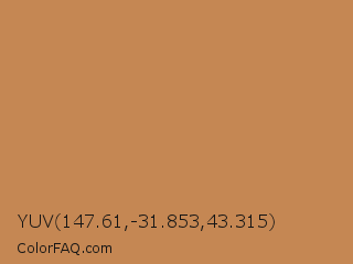 YUV 147.61,-31.853,43.315 Color is a normal orange color and the nearest color is Deer #ba8759. Hex code #c58753 and RGB value is rgb(197,135,83). In RGB color space, this color is composed of 77% red, 53% green, 33% blue, In CMYK color space, this color is composed of 0% cyan, 31% magenta, 58% yellow , 23% black , In HSL color space, this color has a hue angle of 27° , 50% saturation and 55% lightness.