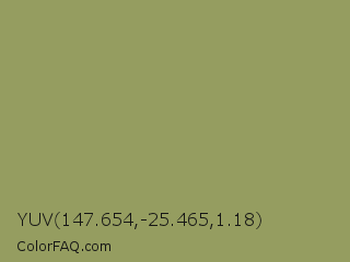 YUV 147.654,-25.465,1.18 Color is a normal yellow color and the nearest color is Moss Green #8a9a5b. Hex code #959d60 and RGB value is rgb(149,157,96). In RGB color space, this color is composed of 58% red, 62% green, 38% blue, In CMYK color space, this color is composed of 5% cyan, 0% magenta, 39% yellow , 38% black , In HSL color space, this color has a hue angle of 68° , 24% saturation and 50% lightness.