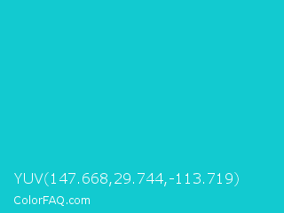 YUV 147.668,29.744,-113.719 Color is a normal cyan color and the nearest color is Dark Turquoise #00ced1. Hex code #12cad0 and RGB value is rgb(18,202,208). In RGB color space, this color is composed of 7% red, 79% green, 82% blue, In CMYK color space, this color is composed of 91% cyan, 3% magenta, 0% yellow , 18% black , In HSL color space, this color has a hue angle of 182° , 84% saturation and 44% lightness.