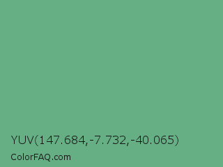 YUV 147.684,-7.732,-40.065 Color is a normal green color and the nearest color is Silver Tree #66b58f. Hex code #66ae84 and RGB value is rgb(102,174,132). In RGB color space, this color is composed of 40% red, 68% green, 52% blue, In CMYK color space, this color is composed of 41% cyan, 0% magenta, 24% yellow , 32% black , In HSL color space, this color has a hue angle of 145° , 31% saturation and 54% lightness.