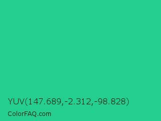 YUV 147.689,-2.312,-98.828 Color is a normal green color and the nearest color is Shamrock #33cc99. Hex code #23ce8f and RGB value is rgb(35,206,143). In RGB color space, this color is composed of 14% red, 81% green, 56% blue, In CMYK color space, this color is composed of 83% cyan, 0% magenta, 31% yellow , 19% black , In HSL color space, this color has a hue angle of 158° , 71% saturation and 47% lightness.