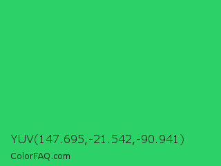 YUV 147.695,-21.542,-90.941 Color is a normal green color and the nearest color is UFO Green #3cd070. Hex code #2cd168 and RGB value is rgb(44,209,104). In RGB color space, this color is composed of 17% red, 82% green, 41% blue, In CMYK color space, this color is composed of 79% cyan, 0% magenta, 50% yellow , 18% black , In HSL color space, this color has a hue angle of 142° , 65% saturation and 50% lightness.