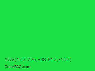 YUV 147.726,-38.812,-105 Color is a normal green color and the nearest color is Malachite #0bda51. Hex code #1ce045 and RGB value is rgb(28,224,69). In RGB color space, this color is composed of 11% red, 88% green, 27% blue, In CMYK color space, this color is composed of 88% cyan, 0% magenta, 69% yellow , 12% black , In HSL color space, this color has a hue angle of 133° , 78% saturation and 49% lightness.