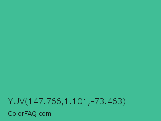 YUV 147.766,1.101,-73.463 Color is a normal green color and the nearest color is Ocean Green #48bf91. Hex code #40be96 and RGB value is rgb(64,190,150). In RGB color space, this color is composed of 25% red, 75% green, 59% blue, In CMYK color space, this color is composed of 66% cyan, 0% magenta, 21% yellow , 25% black , In HSL color space, this color has a hue angle of 161° , 50% saturation and 50% lightness.