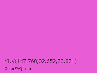 YUV 147.768,32.652,73.871 Color is a light magenta color and the nearest color is Orchid #da70d6. Hex code #e85cd6 and RGB value is rgb(232,92,214). In RGB color space, this color is composed of 91% red, 36% green, 84% blue, In CMYK color space, this color is composed of 0% cyan, 60% magenta, 8% yellow , 9% black , In HSL color space, this color has a hue angle of 308° , 75% saturation and 64% lightness.
