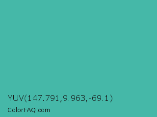 YUV 147.791,9.963,-69.1 Color is a normal cyan color and the nearest color is Verdigris #43b3ae. Hex code #45b8a8 and RGB value is rgb(69,184,168). In RGB color space, this color is composed of 27% red, 72% green, 66% blue, In CMYK color space, this color is composed of 63% cyan, 0% magenta, 9% yellow , 28% black , In HSL color space, this color has a hue angle of 172° , 45% saturation and 50% lightness.