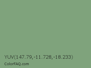 YUV 147.79,-11.728,-18.233 Color is a normal green color and the nearest color is Amulet #7b9f80. Hex code #7fa37c and RGB value is rgb(127,163,124). In RGB color space, this color is composed of 50% red, 64% green, 49% blue, In CMYK color space, this color is composed of 22% cyan, 0% magenta, 24% yellow , 36% black , In HSL color space, this color has a hue angle of 115° , 17% saturation and 56% lightness.