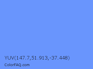 YUV 147.7,51.913,-37.448 Color is a light blue color and the nearest color is Cornflower Blue #6495ed. Hex code #6995fd and RGB value is rgb(105,149,253). In RGB color space, this color is composed of 41% red, 58% green, 99% blue, In CMYK color space, this color is composed of 58% cyan, 41% magenta, 0% yellow , 1% black , In HSL color space, this color has a hue angle of 222° , 97% saturation and 70% lightness.