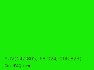 YUV 147.805,-68.924,-106.823 Color is a normal green color and the nearest color is Green #00ff00. Hex code #1aed08 and RGB value is rgb(26,237,8). In RGB color space, this color is composed of 10% red, 93% green, 3% blue, In CMYK color space, this color is composed of 89% cyan, 0% magenta, 97% yellow , 7% black , In HSL color space, this color has a hue angle of 115° , 93% saturation and 48% lightness.