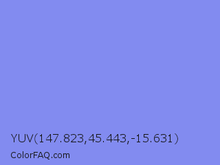 YUV 147.823,45.443,-15.631 Color is a light blue color and the nearest color is Portage #8b9fee. Hex code #828bf0 and RGB value is rgb(130,139,240). In RGB color space, this color is composed of 51% red, 55% green, 94% blue, In CMYK color space, this color is composed of 46% cyan, 42% magenta, 0% yellow , 6% black , In HSL color space, this color has a hue angle of 235° , 79% saturation and 73% lightness.