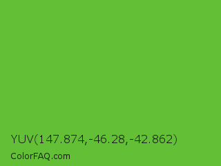 YUV 147.874,-46.28,-42.862 Color is a normal green color and the nearest color is Green RYB #66b032. Hex code #63bf36 and RGB value is rgb(99,191,54). In RGB color space, this color is composed of 39% red, 75% green, 21% blue, In CMYK color space, this color is composed of 48% cyan, 0% magenta, 72% yellow , 25% black , In HSL color space, this color has a hue angle of 100° , 56% saturation and 48% lightness.