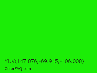 YUV 147.876,-69.945,-106.008 Color is a normal green color and the nearest color is Green #00ff00. Hex code #1bed06 and RGB value is rgb(27,237,6). In RGB color space, this color is composed of 11% red, 93% green, 2% blue, In CMYK color space, this color is composed of 89% cyan, 0% magenta, 97% yellow , 7% black , In HSL color space, this color has a hue angle of 115° , 95% saturation and 48% lightness.