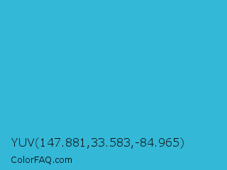 YUV 147.881,33.583,-84.965 Color is a normal cyan color and the nearest color is Scooter #2ebfd4. Hex code #33b8d8 and RGB value is rgb(51,184,216). In RGB color space, this color is composed of 20% red, 72% green, 85% blue, In CMYK color space, this color is composed of 76% cyan, 15% magenta, 0% yellow , 15% black , In HSL color space, this color has a hue angle of 192° , 68% saturation and 52% lightness.