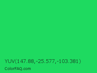 YUV 147.88,-25.577,-103.381 Color is a normal green color and the nearest color is Malachite #0bda51. Hex code #1eda60 and RGB value is rgb(30,218,96). In RGB color space, this color is composed of 12% red, 85% green, 38% blue, In CMYK color space, this color is composed of 86% cyan, 0% magenta, 56% yellow , 15% black , In HSL color space, this color has a hue angle of 141° , 76% saturation and 49% lightness.