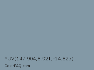 YUV 147.904,8.921,-14.825 Color is a normal blue color and the nearest color is Weldon Blue #7c98ab. Hex code #8399a6 and RGB value is rgb(131,153,166). In RGB color space, this color is composed of 51% red, 60% green, 65% blue, In CMYK color space, this color is composed of 21% cyan, 8% magenta, 0% yellow , 35% black , In HSL color space, this color has a hue angle of 202° , 16% saturation and 58% lightness.