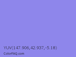 YUV 147.906,42.937,-5.18 Color is a light indigo color and the nearest color is Chetwode Blue #8581d9. Hex code #8e86eb and RGB value is rgb(142,134,235). In RGB color space, this color is composed of 56% red, 53% green, 92% blue, In CMYK color space, this color is composed of 40% cyan, 43% magenta, 0% yellow , 8% black , In HSL color space, this color has a hue angle of 245° , 72% saturation and 72% lightness.