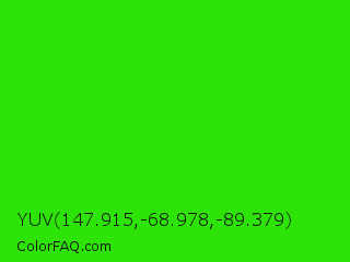YUV 147.915,-68.978,-89.379 Color is a normal green color and the nearest color is Neon Green #39ff14. Hex code #2ee308 and RGB value is rgb(46,227,8). In RGB color space, this color is composed of 18% red, 89% green, 3% blue, In CMYK color space, this color is composed of 80% cyan, 0% magenta, 96% yellow , 11% black , In HSL color space, this color has a hue angle of 110° , 93% saturation and 46% lightness.