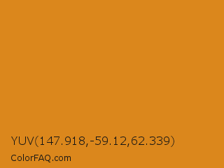 YUV 147.918,-59.12,62.339 Color is a normal orange color and the nearest color is Zest #e5841b. Hex code #db871c and RGB value is rgb(219,135,28). In RGB color space, this color is composed of 86% red, 53% green, 11% blue, In CMYK color space, this color is composed of 0% cyan, 38% magenta, 87% yellow , 14% black , In HSL color space, this color has a hue angle of 34° , 77% saturation and 48% lightness.