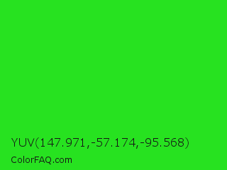 YUV 147.971,-57.174,-95.568 Color is a normal green color and the nearest color is Lime Green #32cd32. Hex code #27e220 and RGB value is rgb(39,226,32). In RGB color space, this color is composed of 15% red, 89% green, 13% blue, In CMYK color space, this color is composed of 83% cyan, 0% magenta, 86% yellow , 11% black , In HSL color space, this color has a hue angle of 118° , 77% saturation and 51% lightness.