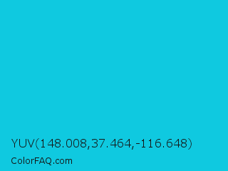 YUV 148.008,37.464,-116.648 Color is a normal cyan color and the nearest color is Dark Turquoise #00ced1. Hex code #0fc9e0 and RGB value is rgb(15,201,224). In RGB color space, this color is composed of 6% red, 79% green, 88% blue, In CMYK color space, this color is composed of 93% cyan, 10% magenta, 0% yellow , 12% black , In HSL color space, this color has a hue angle of 187° , 87% saturation and 47% lightness.