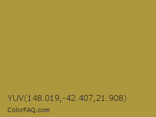 YUV 148.019,-42.407,21.908 Color is a normal yellow color and the nearest color is Brass #b5a642. Hex code #ad983e and RGB value is rgb(173,152,62). In RGB color space, this color is composed of 68% red, 60% green, 24% blue, In CMYK color space, this color is composed of 0% cyan, 12% magenta, 64% yellow , 32% black , In HSL color space, this color has a hue angle of 49° , 47% saturation and 46% lightness.