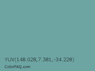 YUV 148.028,7.381,-34.228 Color is a normal cyan color and the nearest color is Green Sheen #6eaea1. Hex code #6da5a3 and RGB value is rgb(109,165,163). In RGB color space, this color is composed of 43% red, 65% green, 64% blue, In CMYK color space, this color is composed of 34% cyan, 0% magenta, 1% yellow , 35% black , In HSL color space, this color has a hue angle of 178° , 24% saturation and 54% lightness.