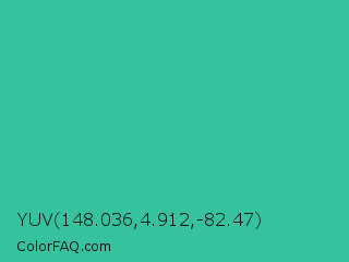 YUV 148.036,4.912,-82.47 Color is a normal cyan color and the nearest color is Shamrock #33cc99. Hex code #36c29e and RGB value is rgb(54,194,158). In RGB color space, this color is composed of 21% red, 76% green, 62% blue, In CMYK color space, this color is composed of 72% cyan, 0% magenta, 19% yellow , 24% black , In HSL color space, this color has a hue angle of 165° , 56% saturation and 49% lightness.