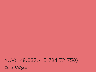 YUV 148.037,-15.794,72.759 Color is a light red color and the nearest color is Candy Pink #e4717a. Hex code #e77074 and RGB value is rgb(231,112,116). In RGB color space, this color is composed of 91% red, 44% green, 45% blue, In CMYK color space, this color is composed of 0% cyan, 52% magenta, 50% yellow , 9% black , In HSL color space, this color has a hue angle of 358° , 71% saturation and 67% lightness.