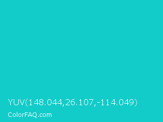 YUV 148.044,26.107,-114.049 Color is a normal cyan color and the nearest color is Java #1fc2c2. Hex code #12ccc9 and RGB value is rgb(18,204,201). In RGB color space, this color is composed of 7% red, 80% green, 79% blue, In CMYK color space, this color is composed of 91% cyan, 0% magenta, 1% yellow , 20% black , In HSL color space, this color has a hue angle of 179° , 84% saturation and 44% lightness.