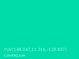 YUV 148.047,11.316,-129.837 Color is a normal cyan color and the nearest color is Caribbean Green #00cc99. Hex code #00dbab and RGB value is rgb(0,219,171). In RGB color space, this color is composed of 0% red, 86% green, 67% blue, In CMYK color space, this color is composed of 100% cyan, 0% magenta, 22% yellow , 14% black , In HSL color space, this color has a hue angle of 167° , 100% saturation and 43% lightness.