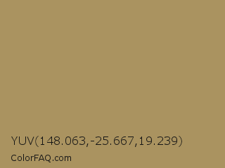 YUV 148.063,-25.667,19.239 Color is a normal orange color and the nearest color is Teak #b19461. Hex code #aa9360 and RGB value is rgb(170,147,96). In RGB color space, this color is composed of 67% red, 58% green, 38% blue, In CMYK color space, this color is composed of 0% cyan, 14% magenta, 44% yellow , 33% black , In HSL color space, this color has a hue angle of 41° , 30% saturation and 52% lightness.