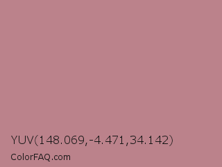 YUV 148.069,-4.471,34.142 Color is a light red color and the nearest color is Brandy Rose #bb8983. Hex code #bb828b and RGB value is rgb(187,130,139). In RGB color space, this color is composed of 73% red, 51% green, 55% blue, In CMYK color space, this color is composed of 0% cyan, 30% magenta, 26% yellow , 27% black , In HSL color space, this color has a hue angle of 351° , 30% saturation and 62% lightness.