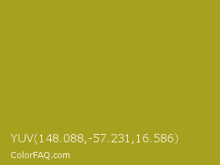 YUV 148.088,-57.231,16.586 Color is a normal yellow color and the nearest color is Lemon Ginger #ac9e22. Hex code #a7a120 and RGB value is rgb(167,161,32). In RGB color space, this color is composed of 65% red, 63% green, 13% blue, In CMYK color space, this color is composed of 0% cyan, 4% magenta, 81% yellow , 35% black , In HSL color space, this color has a hue angle of 57° , 68% saturation and 39% lightness.