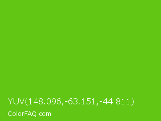 YUV 148.096,-63.151,-44.811 Color is a normal green color and the nearest color is Lima #76bd17. Hex code #61c714 and RGB value is rgb(97,199,20). In RGB color space, this color is composed of 38% red, 78% green, 8% blue, In CMYK color space, this color is composed of 51% cyan, 0% magenta, 90% yellow , 22% black , In HSL color space, this color has a hue angle of 94° , 82% saturation and 43% lightness.