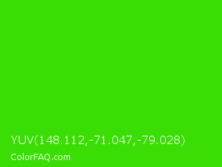 YUV 148.112,-71.047,-79.028 Color is a normal green color and the nearest color is Harlequin Green #46cb18. Hex code #3ade04 and RGB value is rgb(58,222,4). In RGB color space, this color is composed of 23% red, 87% green, 2% blue, In CMYK color space, this color is composed of 74% cyan, 0% magenta, 98% yellow , 13% black , In HSL color space, this color has a hue angle of 105° , 96% saturation and 44% lightness.