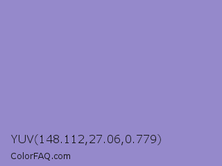 YUV 148.112,27.06,0.779 Color is a light indigo color and the nearest color is Blue Bell Crayola #9999cc. Hex code #9589cb and RGB value is rgb(149,137,203). In RGB color space, this color is composed of 58% red, 54% green, 80% blue, In CMYK color space, this color is composed of 27% cyan, 33% magenta, 0% yellow , 20% black , In HSL color space, this color has a hue angle of 251° , 39% saturation and 67% lightness.