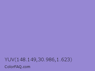YUV 148.149,30.986,1.623 Color is a light indigo color and the nearest color is Chetwode Blue #8581d9. Hex code #9687d3 and RGB value is rgb(150,135,211). In RGB color space, this color is composed of 59% red, 53% green, 83% blue, In CMYK color space, this color is composed of 29% cyan, 36% magenta, 0% yellow , 17% black , In HSL color space, this color has a hue angle of 252° , 46% saturation and 68% lightness.