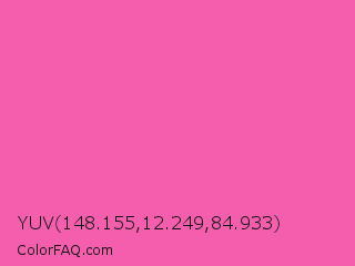 YUV 148.155,12.249,84.933 Color is a light rose color and the nearest color is Brilliant Rose #f653a6. Hex code #f55ead and RGB value is rgb(245,94,173). In RGB color space, this color is composed of 96% red, 37% green, 68% blue, In CMYK color space, this color is composed of 0% cyan, 62% magenta, 29% yellow , 4% black , In HSL color space, this color has a hue angle of 329° , 88% saturation and 66% lightness.