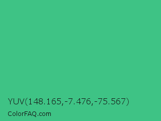 YUV 148.165,-7.476,-75.567 Color is a normal green color and the nearest color is Mint #3eb489. Hex code #3ec385 and RGB value is rgb(62,195,133). In RGB color space, this color is composed of 24% red, 76% green, 52% blue, In CMYK color space, this color is composed of 68% cyan, 0% magenta, 32% yellow , 24% black , In HSL color space, this color has a hue angle of 152° , 53% saturation and 50% lightness.
