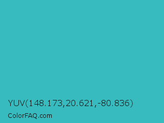 YUV 148.173,20.621,-80.836 Color is a normal cyan color and the nearest color is Maximum Blue Green #30bfbf. Hex code #38bbbe and RGB value is rgb(56,187,190). In RGB color space, this color is composed of 22% red, 73% green, 75% blue, In CMYK color space, this color is composed of 71% cyan, 2% magenta, 0% yellow , 25% black , In HSL color space, this color has a hue angle of 181° , 54% saturation and 48% lightness.