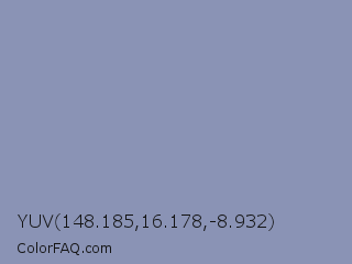 YUV 148.185,16.178,-8.932 Color is a light blue color and the nearest color is Cool Grey #8c92ac. Hex code #8a93b5 and RGB value is rgb(138,147,181). In RGB color space, this color is composed of 54% red, 58% green, 71% blue, In CMYK color space, this color is composed of 24% cyan, 19% magenta, 0% yellow , 29% black , In HSL color space, this color has a hue angle of 227° , 23% saturation and 63% lightness.