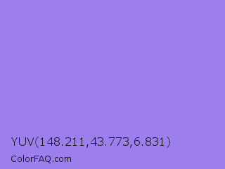 YUV 148.211,43.773,6.831 Color is a light indigo color and the nearest color is Medium Purple #9370db. Hex code #9c7fed and RGB value is rgb(156,127,237). In RGB color space, this color is composed of 61% red, 50% green, 93% blue, In CMYK color space, this color is composed of 34% cyan, 46% magenta, 0% yellow , 7% black , In HSL color space, this color has a hue angle of 256° , 75% saturation and 71% lightness.