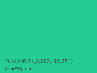 YUV 148.21,0.882,-96.654 Color is a normal green color and the nearest color is Shamrock #33cc99. Hex code #26cc96 and RGB value is rgb(38,204,150). In RGB color space, this color is composed of 15% red, 80% green, 59% blue, In CMYK color space, this color is composed of 81% cyan, 0% magenta, 26% yellow , 20% black , In HSL color space, this color has a hue angle of 160° , 69% saturation and 47% lightness.