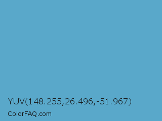 YUV 148.255,26.496,-51.967 Color is a normal blue color and the nearest color is Carolina Blue #56a0d3. Hex code #59a8ca and RGB value is rgb(89,168,202). In RGB color space, this color is composed of 35% red, 66% green, 79% blue, In CMYK color space, this color is composed of 56% cyan, 17% magenta, 0% yellow , 21% black , In HSL color space, this color has a hue angle of 198° , 52% saturation and 57% lightness.