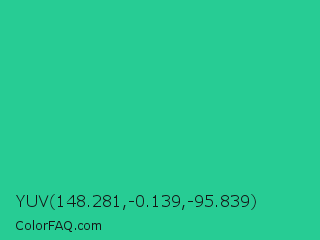 YUV 148.281,-0.139,-95.839 Color is a normal green color and the nearest color is Shamrock #33cc99. Hex code #27cc94 and RGB value is rgb(39,204,148). In RGB color space, this color is composed of 15% red, 80% green, 58% blue, In CMYK color space, this color is composed of 81% cyan, 0% magenta, 27% yellow , 20% black , In HSL color space, this color has a hue angle of 160° , 68% saturation and 48% lightness.