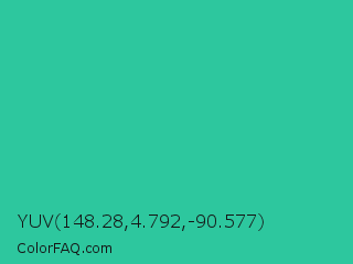YUV 148.28,4.792,-90.577 Color is a normal cyan color and the nearest color is Shamrock #33cc99. Hex code #2dc79e and RGB value is rgb(45,199,158). In RGB color space, this color is composed of 18% red, 78% green, 62% blue, In CMYK color space, this color is composed of 77% cyan, 0% magenta, 21% yellow , 22% black , In HSL color space, this color has a hue angle of 164° , 63% saturation and 48% lightness.