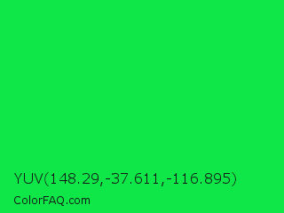 YUV 148.29,-37.611,-116.895 Color is a normal green color and the nearest color is Malachite #0bda51. Hex code #0fe748 and RGB value is rgb(15,231,72). In RGB color space, this color is composed of 6% red, 91% green, 28% blue, In CMYK color space, this color is composed of 94% cyan, 0% magenta, 69% yellow , 9% black , In HSL color space, this color has a hue angle of 136° , 88% saturation and 48% lightness.