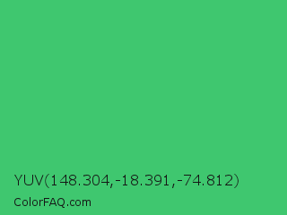 YUV 148.304,-18.391,-74.812 Color is a normal green color and the nearest color is UFO Green #3cd070. Hex code #3fc76f and RGB value is rgb(63,199,111). In RGB color space, this color is composed of 25% red, 78% green, 44% blue, In CMYK color space, this color is composed of 68% cyan, 0% magenta, 44% yellow , 22% black , In HSL color space, this color has a hue angle of 141° , 55% saturation and 51% lightness.