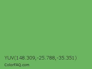 YUV 148.309,-25.788,-35.351 Color is a normal green color and the nearest color is Bud Green #7bb661. Hex code #6cb360 and RGB value is rgb(108,179,96). In RGB color space, this color is composed of 42% red, 70% green, 38% blue, In CMYK color space, this color is composed of 40% cyan, 0% magenta, 46% yellow , 30% black , In HSL color space, this color has a hue angle of 111° , 35% saturation and 54% lightness.